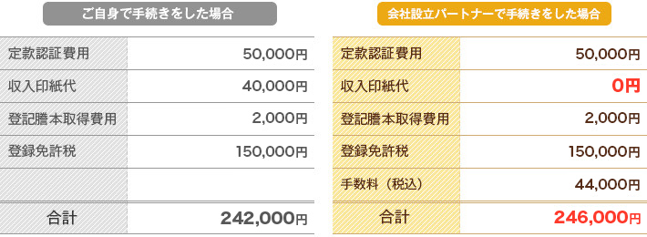 ※定款認証、収入印紙代、定款謄本取得費用、登録免許税は法定費用になります。